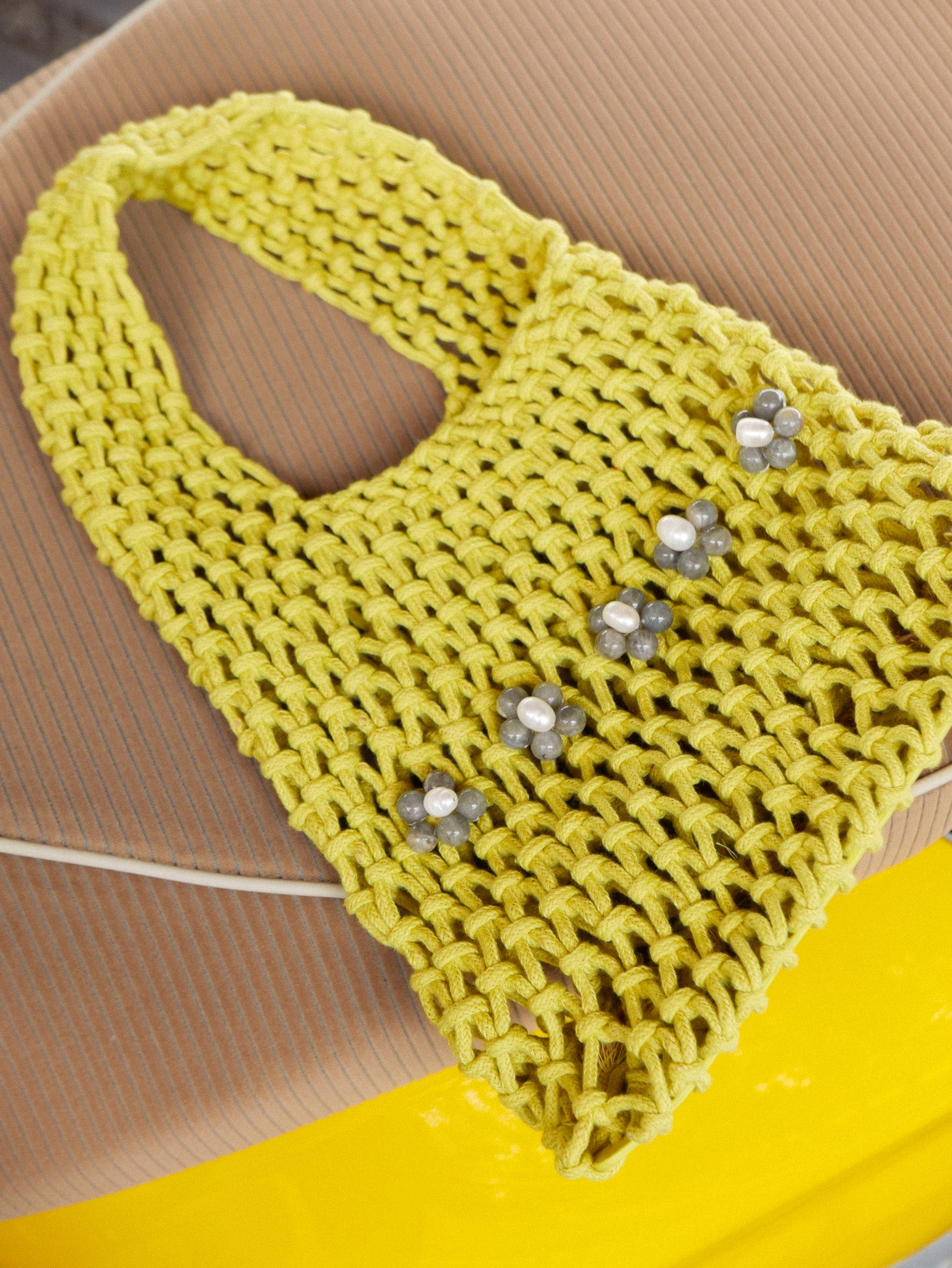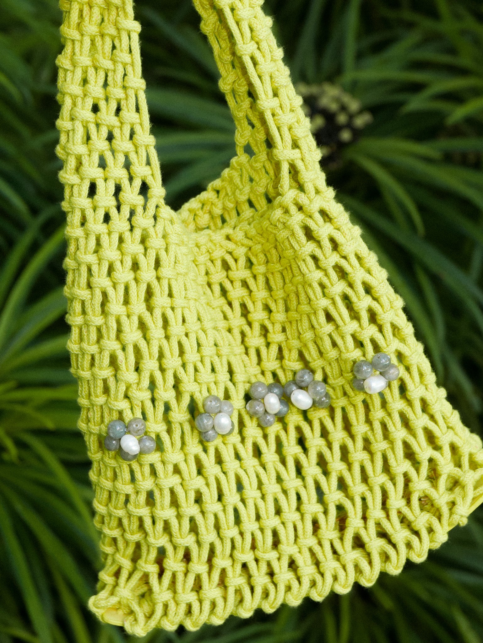 A kiwi colored bag that's all about fun and self-expression, balanced with hues of gray and white.