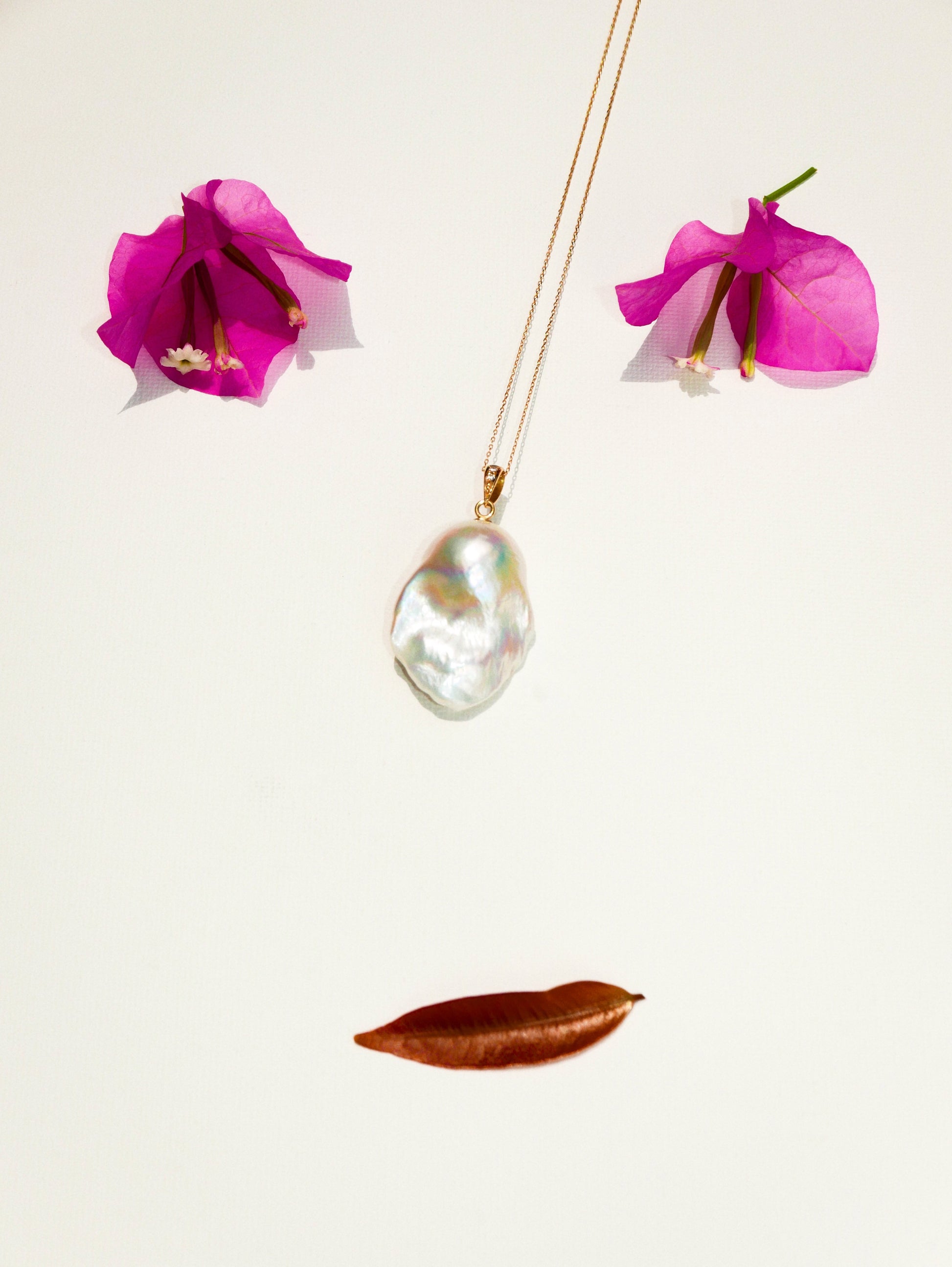 The freshwater baroque pearl's size is 25 mm to 40 mm. Necklace is a size 45 cm 18K gold Azuki chain with a sliding adjuster.