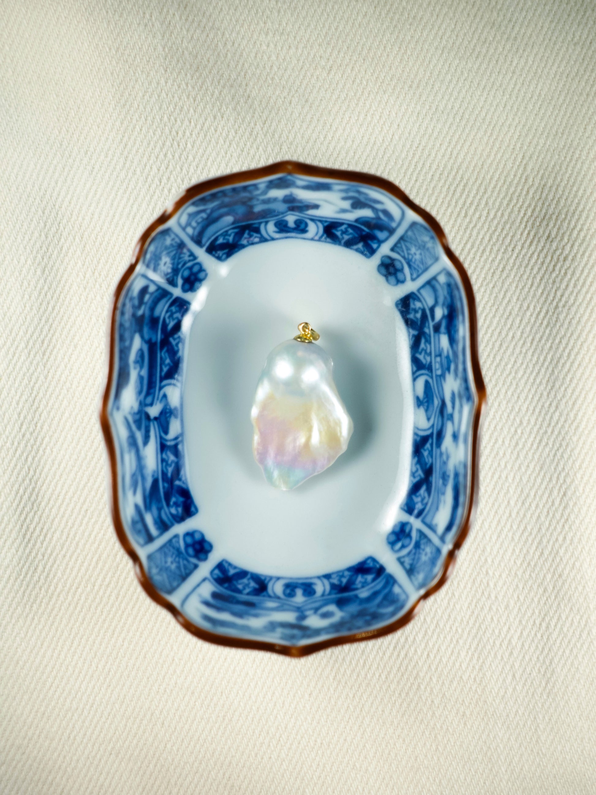 The freshwater baroque pearl's size is 25 mm to 40 mm. The pendant's argolia is 18K gold.